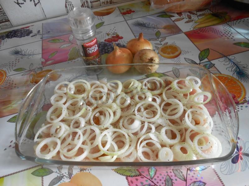 Затем репчатый лук нарезать также не толстыми кольцами. Выложить поверх мяса (если покажется, что лука много, можете уменьшить количество - или увеличить)))). Лук слегка присыпать солью и перцем.