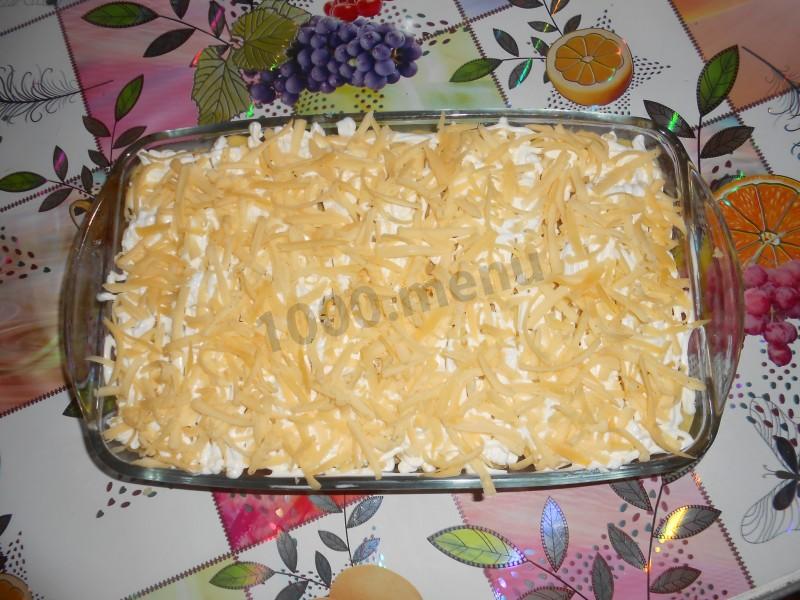 Затем смазать майонезом. Для того, чтобы на этом этапе сильно не заморачиваться (т.е., когда начинаешь размазывать майонез картошка ездит туда-сюда) - лучше покупать майонез в такой упаковке, как на 4-ом фото, срезать совсем маленький уголочек, и просто заливать картошку как на фото - после этого можно не размазывать майонез, а приступать уже к следующему этапу!!))