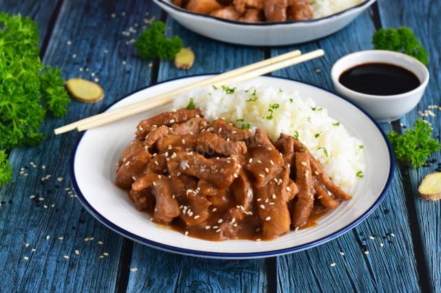 Подавайте свинину по-корейски с гарниром из рассыпчатого отварного риса. По желанию перед подачей можете посыпать мясо кунжутом. Приятного аппетита!