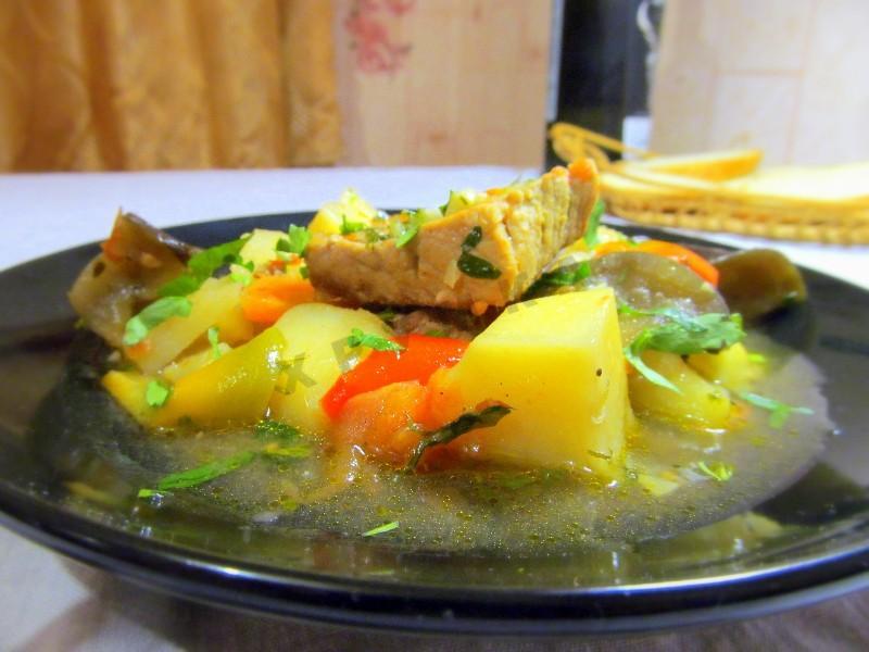 Необходимые ингредиенты. Мясо промыть под проточной водой, картофель, лук и морковь почистить и хорошо помыть, перец, баклажан, помидор и зелень просто помыть и обсушить