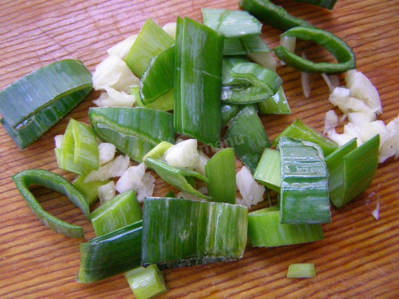 Что с чесноком? Его можно было добавить к говядине, когда она будет жариться. Или сделать, как я – раздавив ножом плашмя, измельчить дольки максимально. Сюда же отправим и зеленую часть порея.
