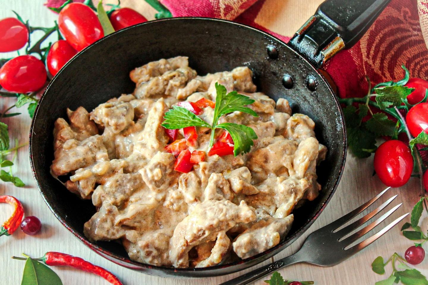 Мясо тушеное в сметане можно подавать с любым гарниром или просто на сковороде со свежими овощами и зеленью.