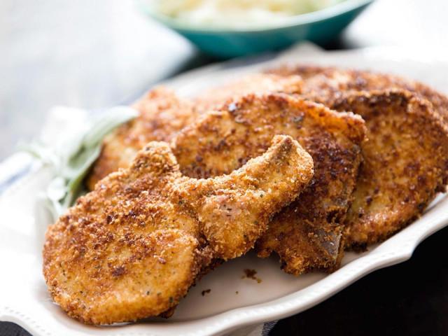 Мясо хорошо помыть, обсушить и порезать на порционные кусочки. Толщина нарезанного куска при этом должна быть не более 1-2 см, так как мясо в льезоне жариться довольно быстро. И свинина должна успеть приготовиться за то время, что жариться панировка.