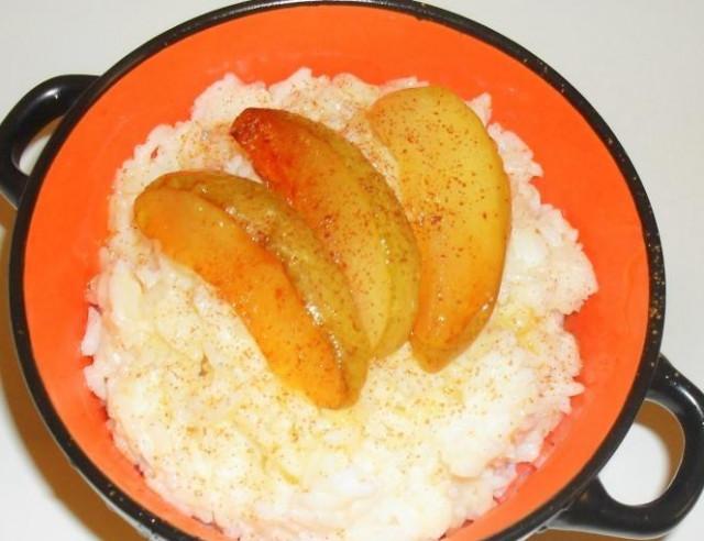 Рис нужно отварить в воде почти до готовности, вода должна полностью выкипеть, либо слейте ее, выложив рис в сито. Затем рис залейте молоком, так, чтобы молоко покрывало рис, но не слишком много. Доведите до кипения. Каша будет более вкусная, если к ней добавить яблоки, закарамелизированные в меде. Для этого нарежьте яблоко тонкими дольками и обжарьте в разогретой сковородке со сливочным маслом, затем добавьте мед и продолжайте жарить минуты 3, помешивая. Готовые дольки посыпьте корицей и выложите сверху на кашу в тарелке.