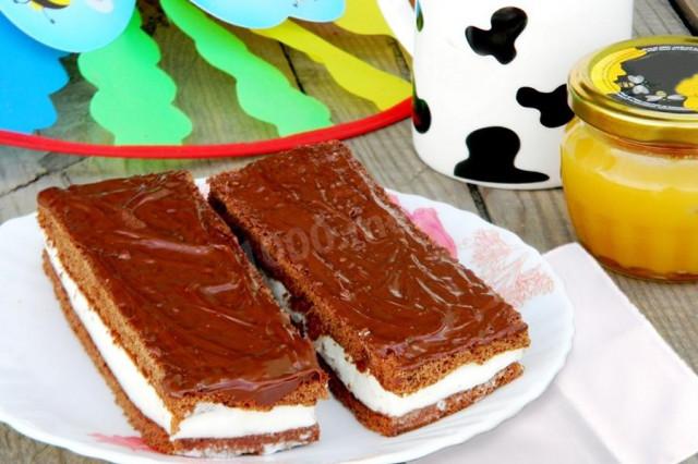 11. Нарезаем бисквит на четыре полоски, смазываем предварительно растопленным шоколадом.