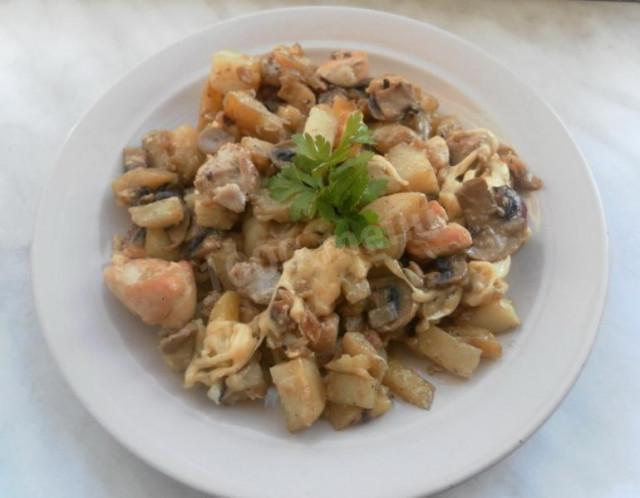 Шампиньоны с луком и соусом перекладываем к картофелю с курицей.