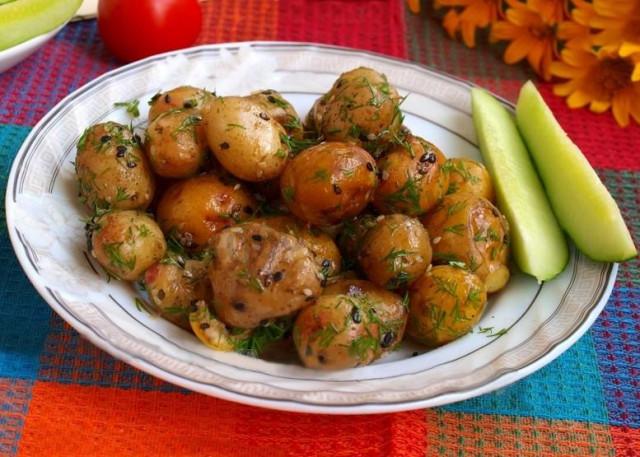 Молодая картошечка так и тает во рту, попробуй! Отлично сочетается с мясом или с огуречно-помидорным салатом. Запекать в духовке картошечку можно до того состояния, которое вам нравится. Можно сделать его таким, как на фото - полностью золотистым, можно не увлекаться этим и оставить нежно-золотистую корочку.