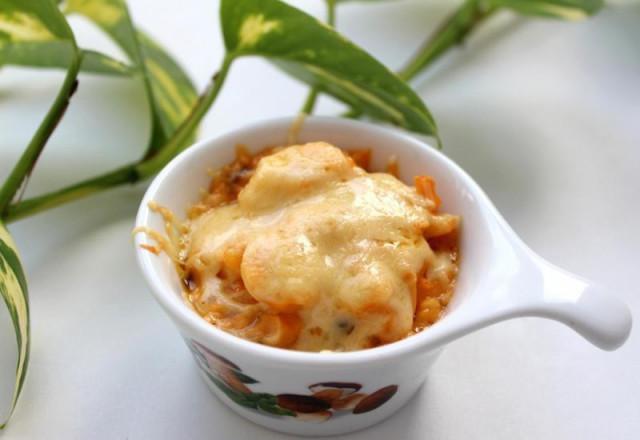 Возьмите кокотницы, смажьте их оливковым маслом, наполните морепродуктами, посыпьте сверху тертым сыром. Запекайте в духовке 10-16 минут при 200 градусах. Как только образовалась аппетитная золотистая корочка – вынимайте!