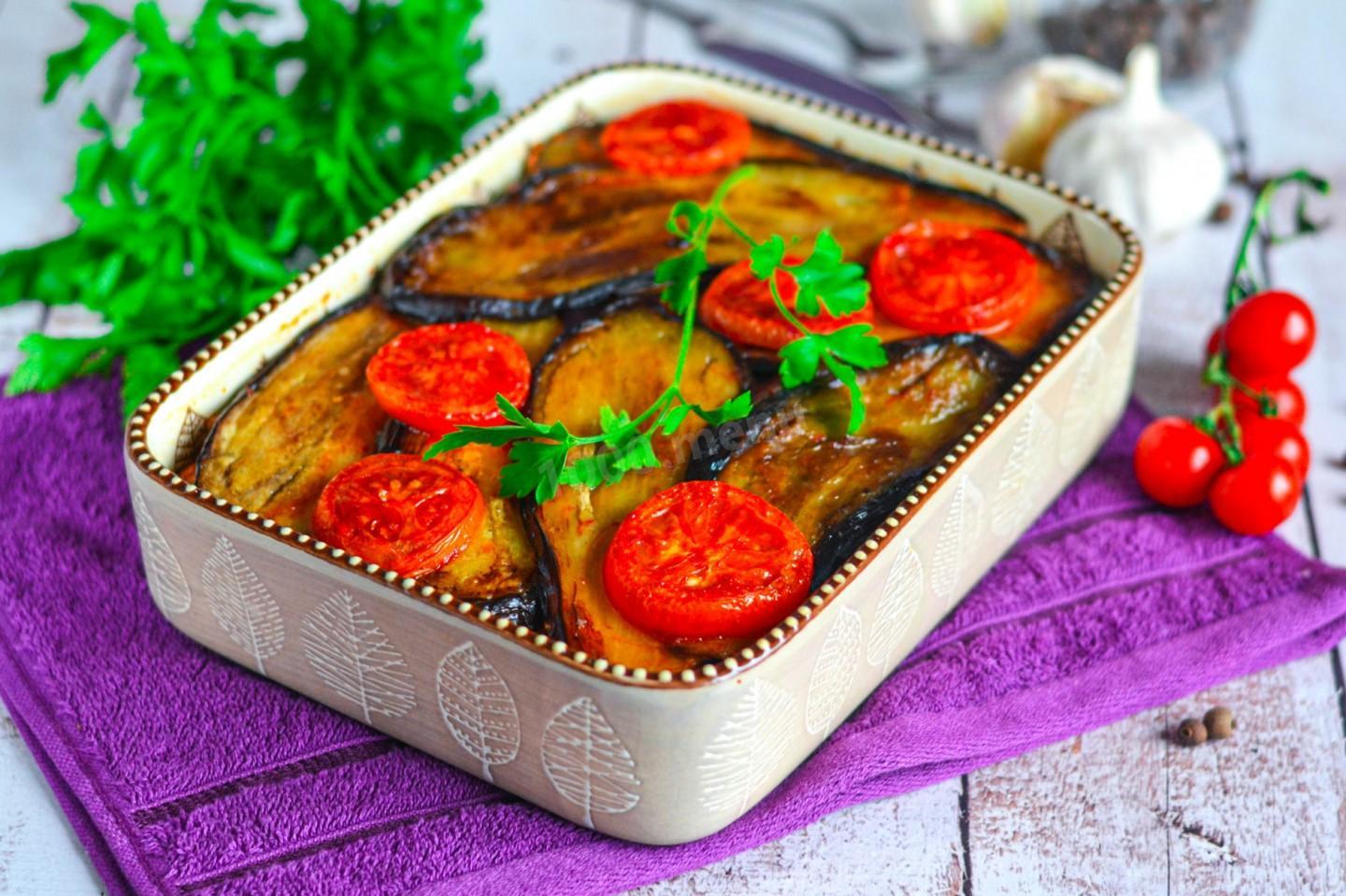 На баклажаны уложите кружочки помидоров. При желании верх также можно присыпать тертым сыром. Запекайте мусаку около 25 минут при 190°С.