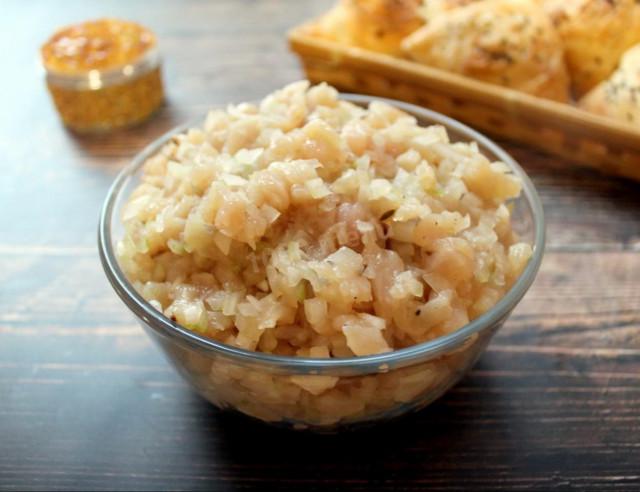 Лук очищаем от шелухи, промываем и также нарезаем очень маленькими кубиками. Лук можно измельчить в чаше блендера, но ни в коем случае не используем для этого терку, так как выделяемый от лука сок должен полностью попасть в начинку, чтобы она была сочной.