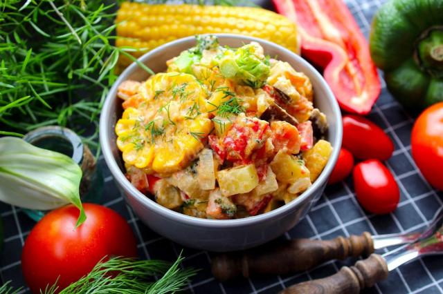 Далее нужно овощи измельчить. Способ нарезки может быть любым на ваше усмотрение. Нарежьте баклажаны, помидоры, лук, морковку, болгарский перец и картофель кусочками одинакового размера. При желании удалите кожуру с помидоров. Кукурузу измельчите тонкими кружочками, а чеснок пропустите через пресс или чеснокодавилку.