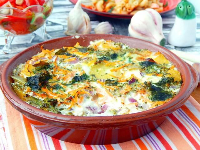Заливаем смесью овощи в форме. Форму закрываем сверху фольгой, ставим в разогретую до 180 градусов духовку на 25 минут. Затем фольгу снимаем, сверху присыпаем тертым сыром и ставим в духовку еще на 5 минут. Подаем блюдо к столу. Приятного аппетита!