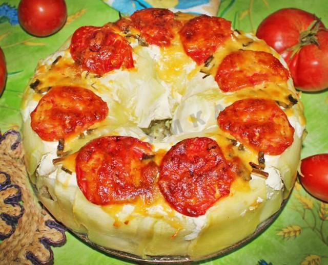 Стакан аккуратно убираем. Верх и бока обмазываем сметаной, выкладываем дольки помидоров, зеленый лук и остатки сыра. Ставим в разогретую до 200 градусов духовку и запекаем 1 час 30 минут. Если сыр зарумянится раньше, накройте фольгой.
