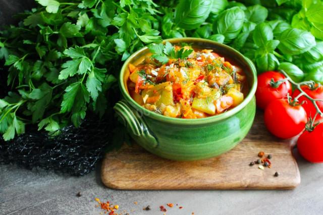 Готовое блюдо посыпать мелко нарезанной зеленью и чесноком, пропущенным через пресс или нарубленным от руки. Хорошо перемешать, закрыть кастрюлю крышкой, снять рагу с огня и дать настояться не менее пяти минут.