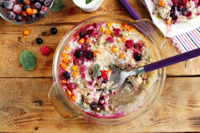Заливаем молочно-яичной смесью овсянку в форме для запекания. Жидкости должно быть больше сухой овсянки в два раза. Духовой шкаф разогреваем до 180 градусов и запекаем овсянку около 30 минут.
