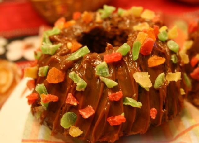 Вынимаем, остужаем, смазываем кулич вареной сгущенкой, посыпаем нарезанными цукатами - готово!