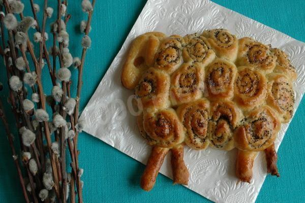 Выложить кусочки "рулета" на “тело” барашка. Дать расстоятся, смазать взбитым яйцом и выпекать при 180 градусах до румяного цвета. Пасхальный барашек готов!