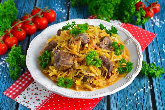 Накройте сковороду крышкой и тушите капусту с печенкой 25-30 минут до готовности. Приятного аппетита!