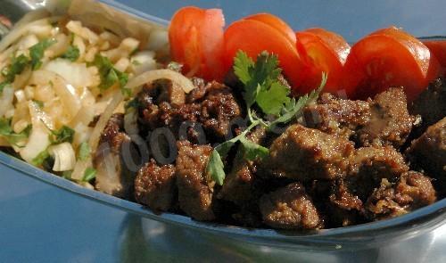 Под конец заправляем печень черным и кайенским перцем, солим и выкладываем на подогретую тарелку. Рядом кладем маринованный лук. В качестве гарнира кладем разрезанные на 8 частей помидоры (предварительно удалив плодоножки).