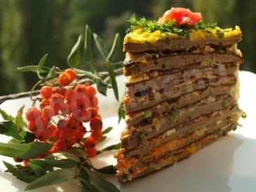 Вкуснейший печеночный торт с овощной начинкой - идеален к празднику! Очень понравилась такая начинка и печёночные коржи очень вкусные. Вкусная и сытная закуска. Очень понравилось сочетание моркови с луком и грибами. Да да, вы не ослышались. Не зря же печеночный торт рецепт с таким говорящим названием. Кроме печени, туда идут разномастные овощи и те же грибы. И то и другое, равно как и сорт печени, могут свободно комбинироваться в разных вариациях, на вкус кулинара. Готовый печеночный торт рецепт с фото представляет собой результат одной из таких случайных, подобранных в процессе готовки комбинаций.