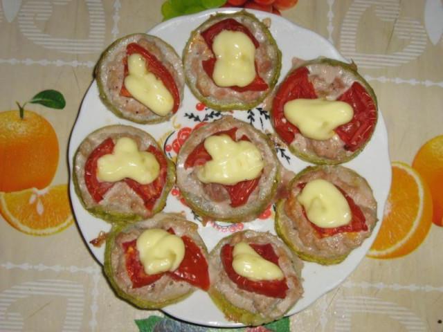 Берем протвень. Наливаем на него достаточное количество подсолнечного масла (кабачки быстро впитывают его), выкладываем кабачата, на них фарш, на фарш помидорчик и все это смазываем майонезом.