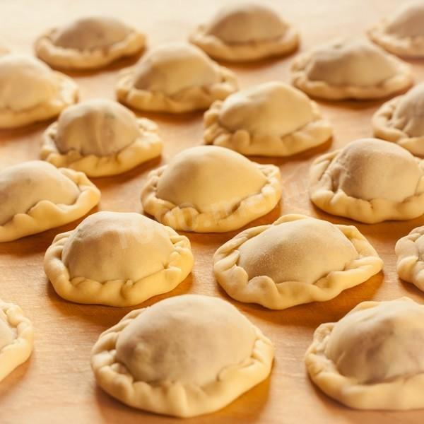 После этого вливаем немного сливок (козьего молока), но не больше чем половина стакана. Лепим пельмени. На середину кружочков кладем одну чайную ложку начинки и лепим края.