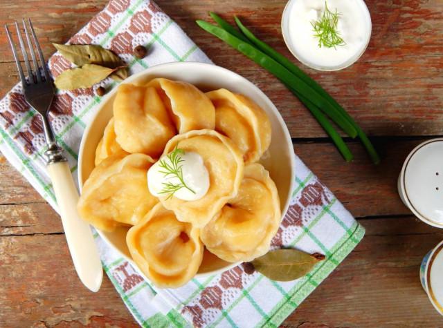 Подаем горячие пельмени со сметаной и зеленью. Приятного аппетита!