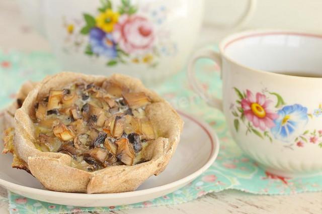 В остывшую грибную начинку разбиваем яйцо, перемешиваем. Наполняем тарталетки начинкой и отправляем в духовку, разогретую до 200 градусов, на 25-30 минут (все зависит от типа духовки).