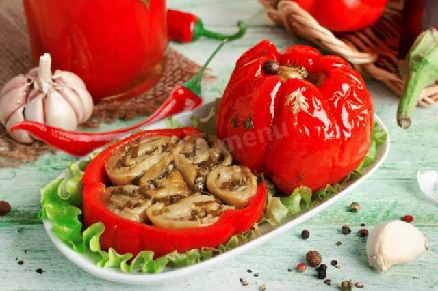 - на дно банки покладите душистый перец и лавровый лист, затем разместите фаршированный перец (сколько поместится), залейте горячим маринадом и отправьте в духовку разогретую до 180 градусов на 40 минут;