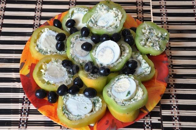 Приступаем к заключительному процессу. Поделюсь секретом, как фаршировать болгарский перец. Я делаю так: перцы наполняем немного салатом, в каждый вкладываем отваренное вкрутую яйцо и осторожно заполняем оставшееся пространство нашим сырным салатом, плотно утрамбовывая, чтобы не было пустот. Нафаршировав все перцы, убираем их на 1-2 часа в холодильник, чтобы сырная масса немного затвердела.
