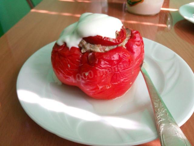 Начините перцы. Я, чтоб равномерно распределить начинку, кладу сперва в каждый перчик по ложке начинки, потом еще по ложке и так вся начинка равномерно распределяется по перцам. Если ее получилось много, можете утрамбовать посильнее. Положите сверху по пару кружочков помидор. И в духовку на 180 С* на минут 40-60. Следите сами, как перец стане мягким, выключайте духовку.