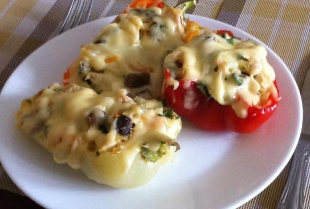 5. На смазанный противень выкладываем половинки перца, заполняем начинкой и отправляем в разогретую до 180-200° С духовку на 30 минут.