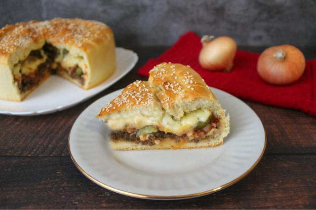 Знаменитый на весь мир «Чизбургер» в новом оформлении! Та же кунжутная булочка, говяжья котлета, маринованные огурчики и, конечно же, сыр, но уже в одном большом пироге! Таким пирогом можно накормить все семью: и сытно, и вкусно. А можно нарезать на порционные кусочки и взять с собой на перекус.