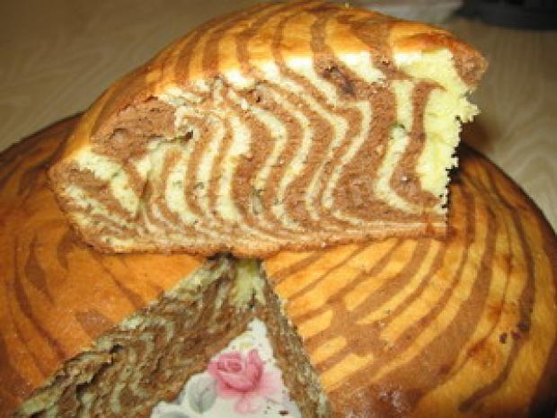 Давайте начнем его приготовления с теста. Для этого возьмите 100 грамм сливочного масла и тщательно его разотрите. Затем, продолжая растирать, добавьте 180 грамм сахара. В другой посуде взбейте 5 яиц с сахаром в размере тоже 180 грамм. Как только это сделаете, смешайте содержимое двух емкостей между собой. Далее возьмите сметану и добавьте в нее соду или разрыхлитель, хорошо перемешайте и влейте сметану в первую основу будущего пирога. Далее очень аккуратно, маленькими порциями добавьте муку. Теперь самое главное. Делим тесто на две равные части и в одну из них добавляем какао и размешиваем. Потом возьмите свою любимую форму для выпечки, смажьте ее маслом. Кладем в нее поочередно то две ложки светлого теста, то две ложки темного теста. После того, как все выложили, ставим пирог в духовку, разогретую до 180 градусов на 1 час. Если вы любите шоколад, то полейте готовый пирог шоколадной помадкой. Можно украсить его орехами, изюмом. Ух, как вкусно! Аж, слюнки потекли. Это не еда, а дар Богов для сластен.