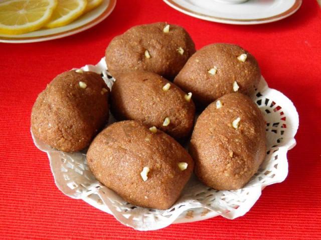 Конечно, если вы будете делать пирожные на праздничный стол их лучше лепить ровные, аккуратные, как в магазине. А если вы готовите с детьми, для воскресного чаепития, то тут можно дать волю фантазии - картошка бывает разных размеров и форм. У меня получилось 14 пирожных примерно одинакового размера. Орехи можно взять любые: фундук, грецкий или миндаль. А можно обойтись и без них.