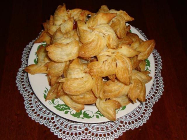 Берем 500г. слоеного недрожжевого теста и раскатываем,из дух половинок получаем размер 32на 24см.,нарезаем 8на8см,всего 24квадатика.