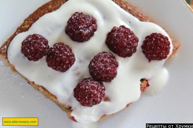 Приготовленное тесто выкладываем ровным слоем на предварительно смазанный маслом противень. Затем кладём на тесто ягоды малины и помещаем противень в разогретую до 180 градусов духовку на 15-20 минут. Готовый бисквит режем на куски ножом или специальными формами, промазываем сметаной, укладываем на пирожные свежую малину и присыпаем сахарной пудрой.
