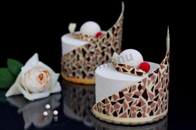Украсила я шоколадом. Для этого взяла шоколад растопила его в микроволновке и намазала на специальную пленку с шоколадными рисунками. Которую заранее обрезала по форме. Итак, когда шоколад слегка начал застывать я его обернула вокруг нашей формы. Когда совсем застынет снимаем пленку а шоколад остается такой формы. Ставим наше пирожное на песочную подставку и оборачиваем шоколадом. Приятного аппетита.