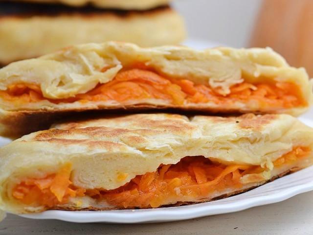 Натрите тыкву на крупной терке. Раскатайте 1 часть теста, в середину выложите тыкву и посыпьте сахаром, оставляя края пустыми. Края полученного теста складывайте к середине, получая при этом плоский мешочек. Так, чтобы середина была плотно закрыта. Немного раскатайте сверху - совсем чуть-чуть для укрепления швов.