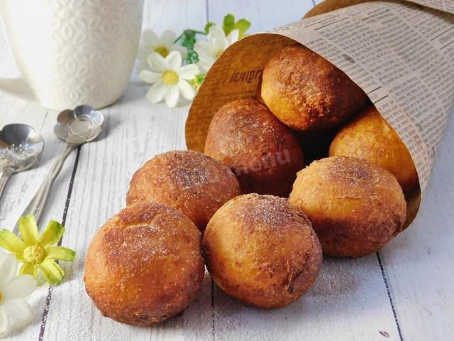 В небольшую, но глубокую сковороду налейте растительное масло. Его должно быть достаточное количество, чтобы пончики жарились в нем свободно. Разогрейте масло до горячего состояния. Выложите шарики из теста в горячее масло. Только делайте это очень аккуратно, чтобы не обжечь руки. Удобно опускать шарики по одному. Обжарьте их на среднем огне до аппетитного, золотистого цвета.
