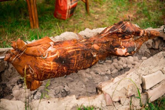 6. Установите вертел над подготовленными заранее углями. Обжаривайте до готовности, крутя вертел. Поросенок должен покрыться хрустящей аппетитной корочкой снаружи, внутри быть сочным и прожаренным - температура готового поросенка составляет 77 градусов.