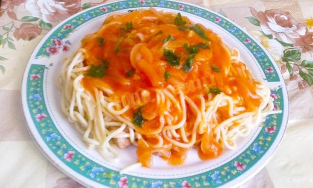 Готовим продукты по списку и смотрим по рецепту, как сварить постные макароны с томатным соусом.
