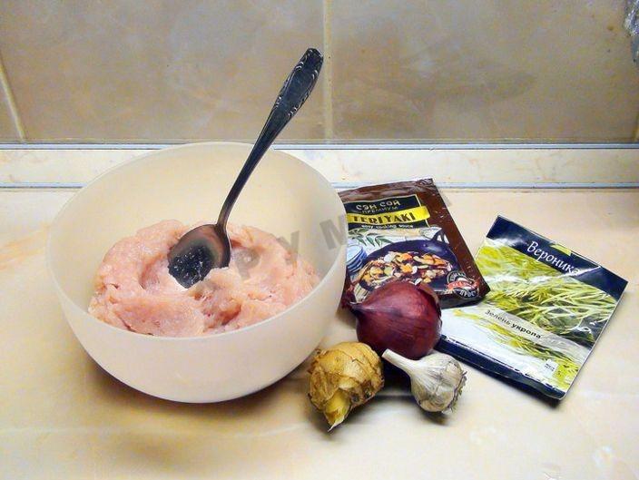 Смешать с куриным фаршем, добавить соус Терияки и рисовую муку, вымешать.