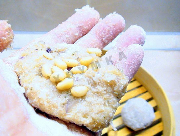 Пряные куриные шарики с кедровыми орешками на пару
