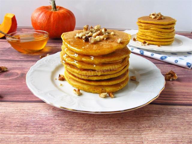 Для приготовления пряных панкейков с тыквой понадобятся: тыква, яйца, сахар, соль, молоко, растительное масло, разрыхлитель, корица, гвоздика, мускатный орех, имбирь, мука; грецкие орехи и мед для подачи.
