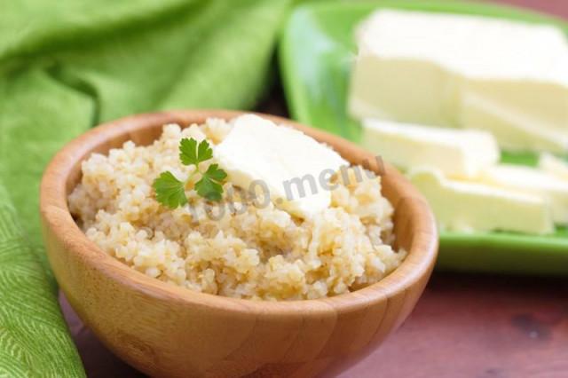 Когда вода почти полностью выпарится, добавьте сливочное масло, перемешайте, после чего снимите кастрюлю с плиты, закройте крышкой. Можно даже укутать кастрюлю с кашей.Пусть она так постоит минут 20.