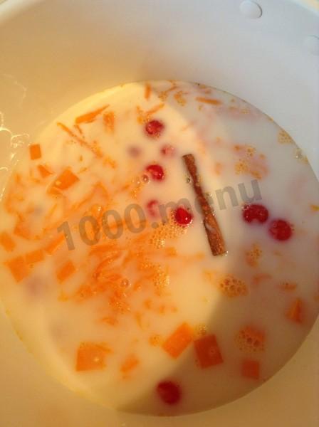 В чашу мультиварки складываем тыкву, пшено и вишню. Несколько вишен оставить для украшения.