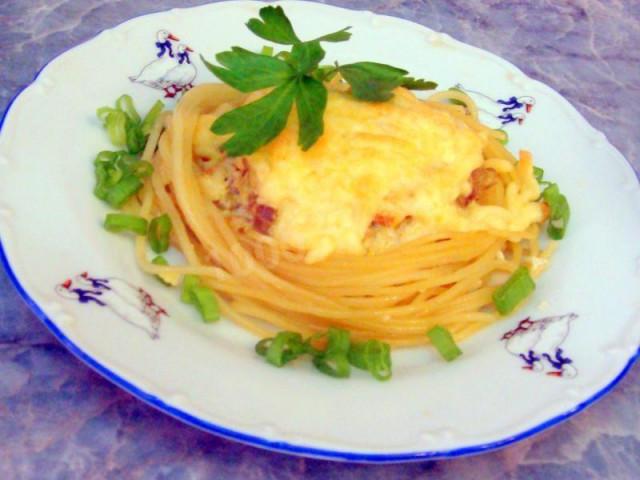 Отдельно сварить спагетти в подсоленной воде до готовности, воду слить, заправить спагетти сливочным маслом.