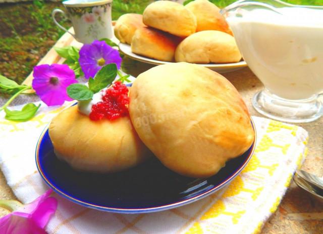 Когда пышки немного увеличатся, выпекаем их в духовке при температуре 180 градусов до румяности или обжариваем на сковороде на хорошо разогретом растительном масле. При первом способе готовки пышек выпечка получается менее калорийной и менее жирной. Пышки получаются мягкие с воздушным пористым мякишем и румяной хрустящей корочкой. Подаем с вареньем, сметаной или медом по желанию к чаю либо кофе. Приятного аппетита!