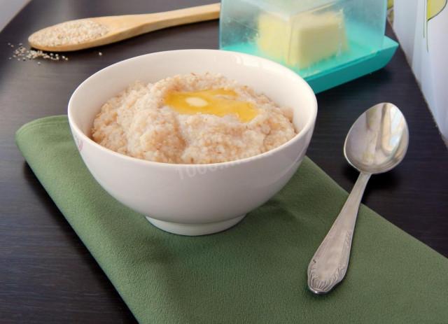 Когда вода закипит, начинаем всыпать в нее крупу, всыпаем тонкой струйкой, постоянно помешивая ложкой кашу, чтобы она не слиплась и не прилипла к дну кастрюли. Затем огонь уменьшаем, делаем его маленьким. Кастрюлю закрываем крышкой и томим кашу около 10 минут. Смотрим, если жидкость выпарилась, выключаем огонь, перемешиваем кашу, добавляем кусочек сливочного масла, закрываем кастрюлю крышкой и еще оставляем на 10-15 минут. Кашу перемешиваем, чтобы она напиталась маслом и подаем к столу. Каша особенно вкусна горячая и свежая, поэтому лучше варить ее на один прием, потому что после разогрева вкус уже ухудшается.